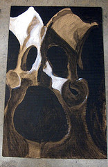 Although this acrylic painting on cardboard looks like some sort of grotesque face it is actually a painting of an animal's pelvic bone.