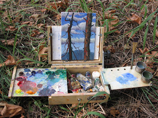 I am a plein-air (open-air) painter and usually find my "Painting Stations" while on bike. Consequently I need to travel lightly. I use a Guerrilla Painter ThumBox, a pochade box. See the photo below: